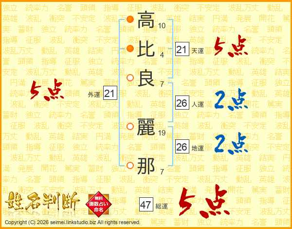 高(10画)比(4画)良(7画) 麗(19画)那(7画)