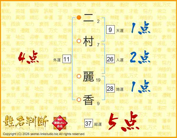 生活面を象徴する運勢です。外部から受ける影響力を表し、結婚運、家庭運や職場、環境への順応性を表します。総運から人運を引いた画数。姓や名が1文字の場合を除く。