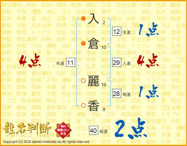 生活面を象徴する運勢です。外部から受ける影響力を表し、結婚運、家庭運や職場、環境への順応性を表します。総運から人運を引いた画数。姓や名が1文字の場合を除く。