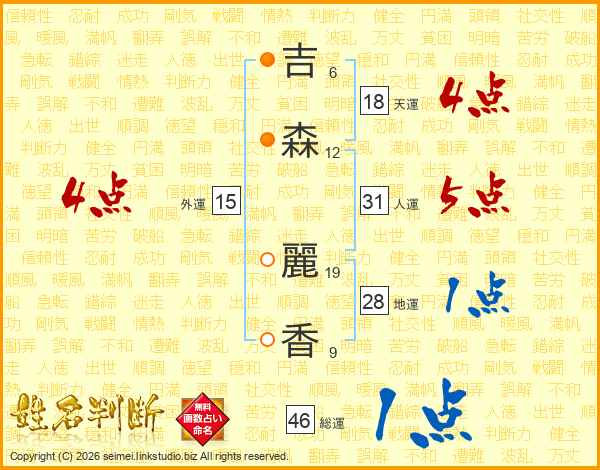 吉(6画)森(12画) 麗(19画)香(9画)