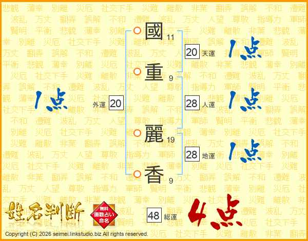 國(11画)重(9画) 麗(19画)香(9画)