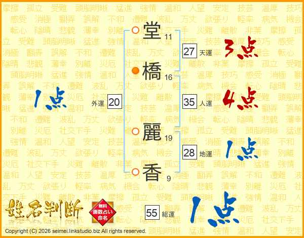 堂(11画)橋(16画) 麗(19画)香(9画)