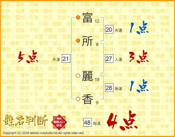 生活面を象徴する運勢です。外部から受ける影響力を表し、結婚運、家庭運や職場、環境への順応性を表します。総運から人運を引いた画数。姓や名が1文字の場合を除く。