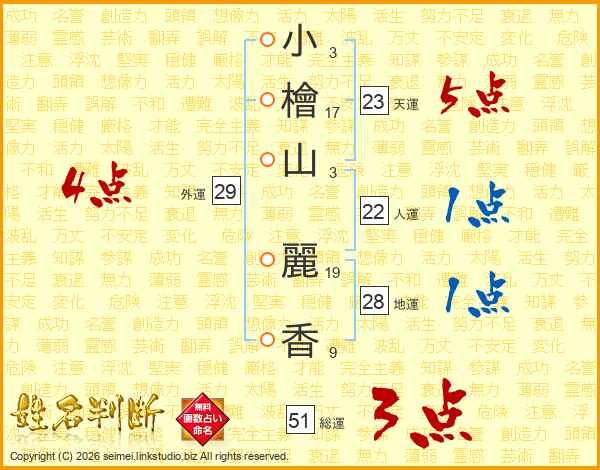 小(3画)檜(17画)山(3画) 麗(19画)香(9画)