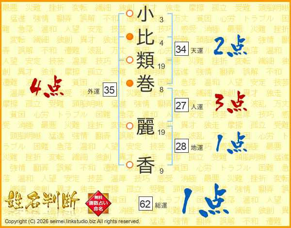 小(3画)比(4画)類(19画)巻(8画) 麗(19画)香(9画)