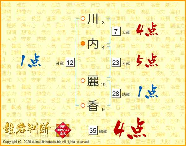 川(3画)内(4画) 麗(19画)香(9画)