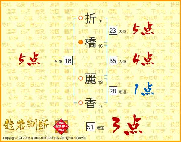 生活面を象徴する運勢です。外部から受ける影響力を表し、結婚運、家庭運や職場、環境への順応性を表します。総運から人運を引いた画数。姓や名が1文字の場合を除く。
