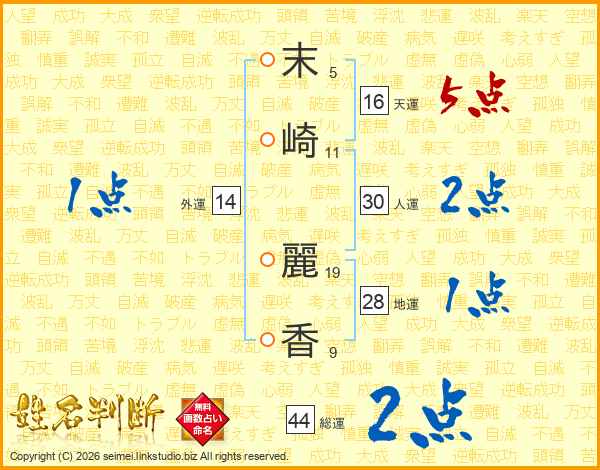 生活面を象徴する運勢です。外部から受ける影響力を表し、結婚運、家庭運や職場、環境への順応性を表します。総運から人運を引いた画数。姓や名が1文字の場合を除く。