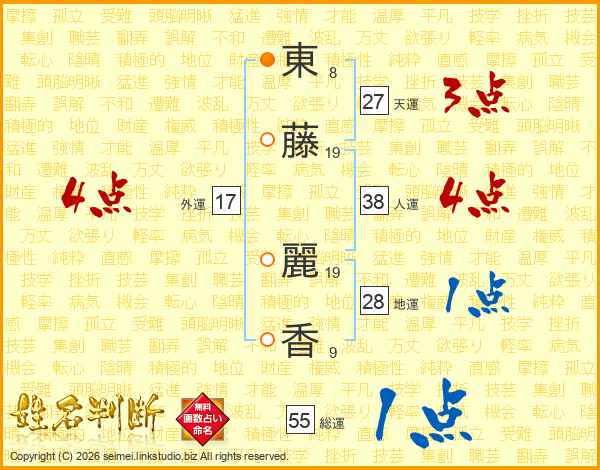東(8画)藤(19画) 麗(19画)香(9画)