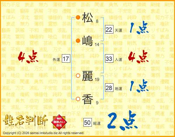 松(8画)嶋(14画) 麗(19画)香(9画)