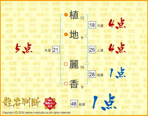植(12画)地(6画) 麗(19画)香(9画)