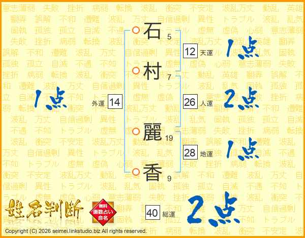 石(5画)村(7画) 麗(19画)香(9画)