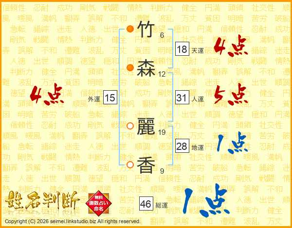 竹(6画)森(12画) 麗(19画)香(9画)