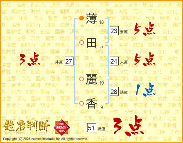薄(18画)田(5画) 麗(19画)香(9画)