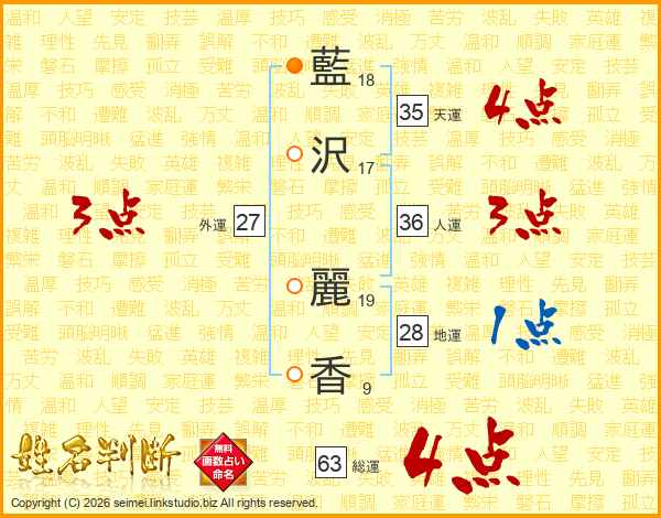 藍(18画)沢(17画) 麗(19画)香(9画)