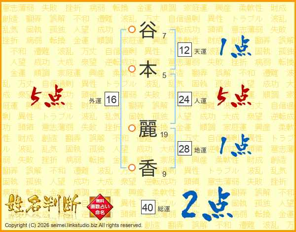 谷(7画)本(5画) 麗(19画)香(9画)