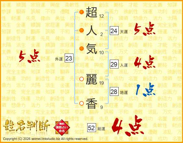 超(12画)人(2画)気(10画) 麗(19画)香(9画)