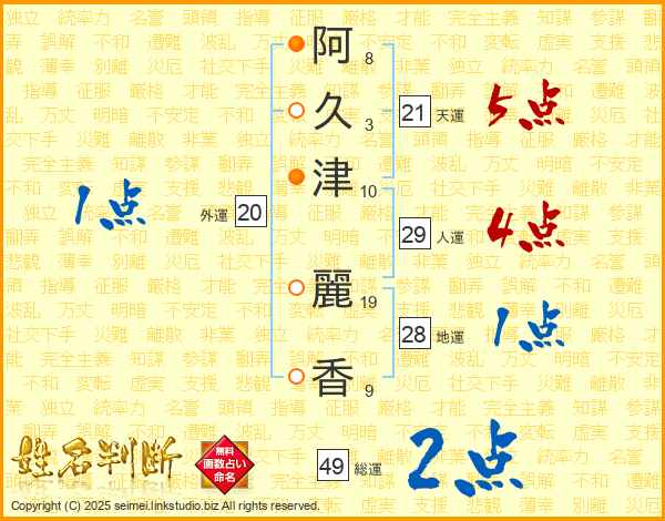 阿(8画)久(3画)津(10画) 麗(19画)香(9画)