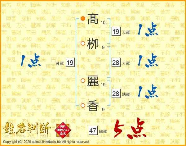 髙(10画)栁(9画) 麗(19画)香(9画)