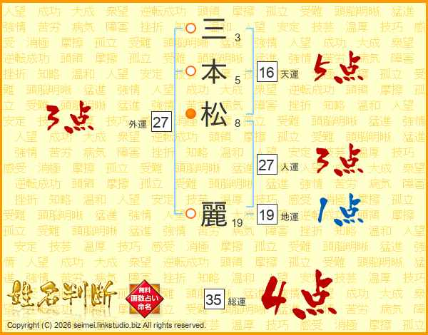 あなたの人生を表す1番重要な運勢です。生涯を通じて影響する総合運となり、主に50歳以降の晩年期に影響を及ぼします。苗字と名前の合計画数。