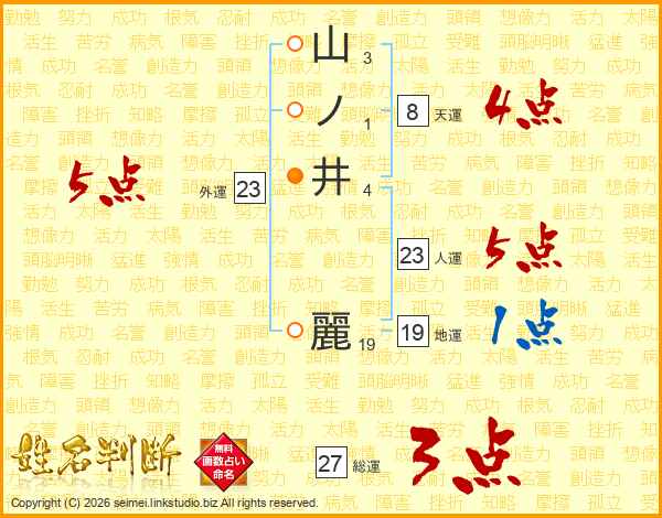 山(3画)ノ(1画)井(4画) 麗(19画)
