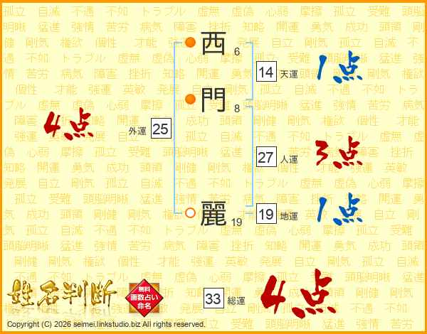 生活面を象徴する運勢です。外部から受ける影響力を表し、結婚運、家庭運や職場、環境への順応性を表します。総運から人運を引いた画数。姓や名が1文字の場合を除く。
