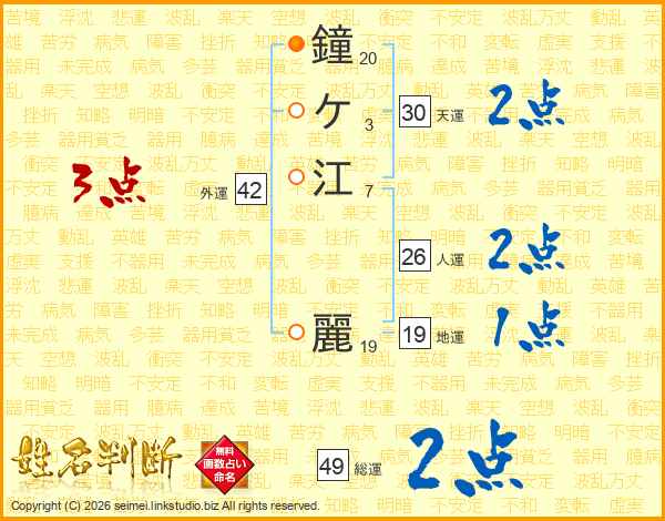 鐘(20画)ケ(3画)江(7画) 麗(19画)