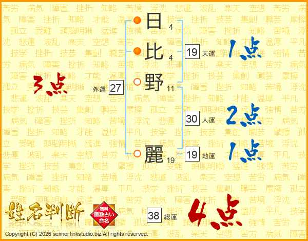 日(4画)比(4画)野(11画) 麗(19画)