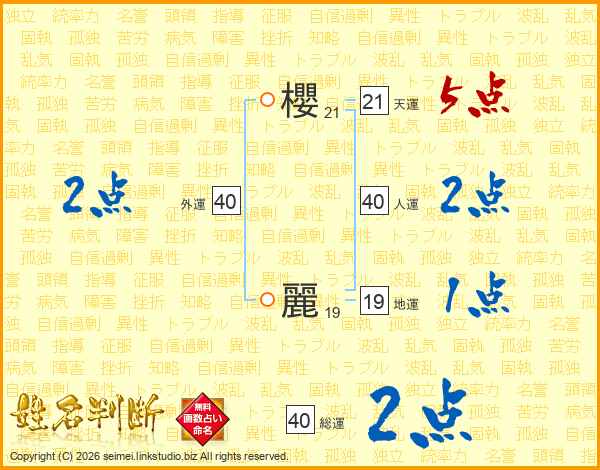 生活面を象徴する運勢です。外部から受ける影響力を表し、結婚運、家庭運や職場、環境への順応性を表します。総運から人運を引いた画数。姓や名が1文字の場合を除く。