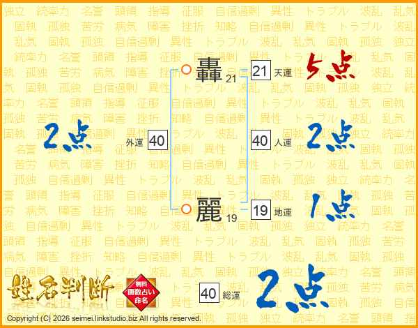生活面を象徴する運勢です。外部から受ける影響力を表し、結婚運、家庭運や職場、環境への順応性を表します。総運から人運を引いた画数。姓や名が1文字の場合を除く。