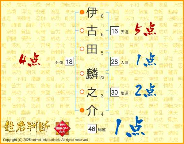 伊(6画)古(5画)田(5画) 麟(23画)之(3画)介(4画)
