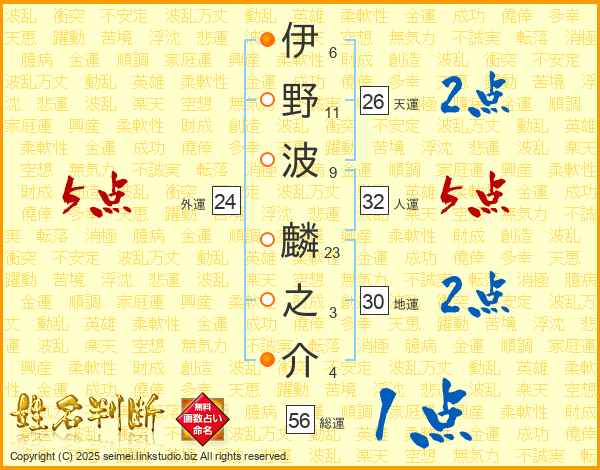 伊(6画)野(11画)波(9画) 麟(23画)之(3画)介(4画)
