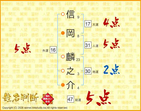 信(9画)岡(8画) 麟(23画)之(3画)介(4画)