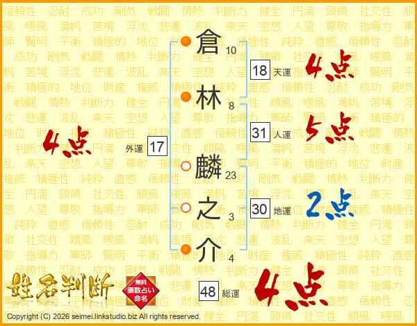 倉(10画)林(8画) 麟(23画)之(3画)介(4画)