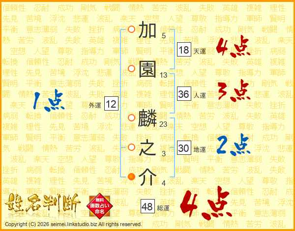 加(5画)園(13画) 麟(23画)之(3画)介(4画)