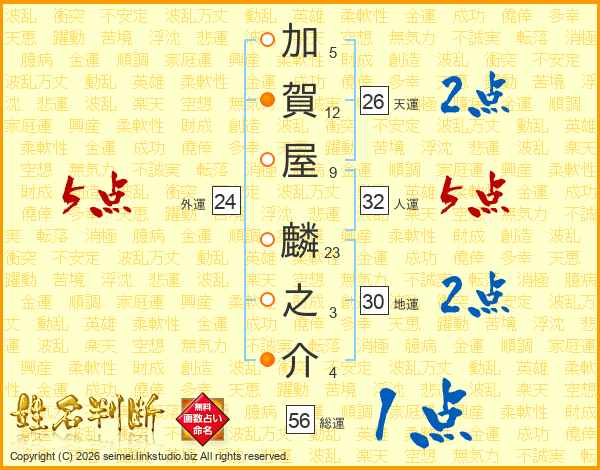 加賀屋麟之介さんの天運は26画の2点!