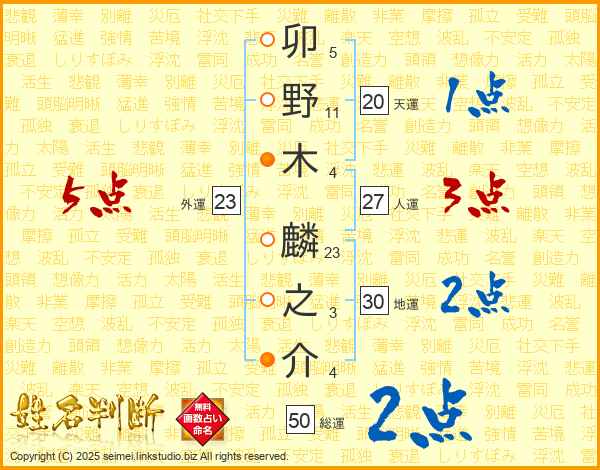 卯(5画)野(11画)木(4画) 麟(23画)之(3画)介(4画)