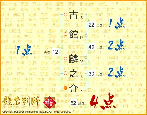 古(5画)館(17画) 麟(23画)之(3画)介(4画)