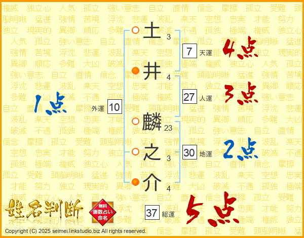土(3画)井(4画) 麟(23画)之(3画)介(4画)
