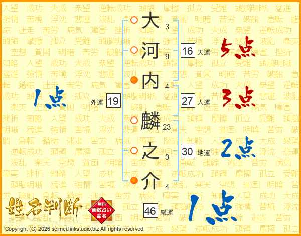 大(3画)河(9画)内(4画) 麟(23画)之(3画)介(4画)