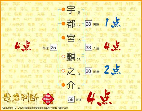 宇(6画)都(12画)宮(10画) 麟(23画)之(3画)介(4画)