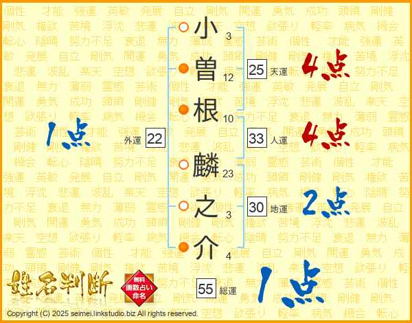 小(3画)曽(12画)根(10画) 麟(23画)之(3画)介(4画)