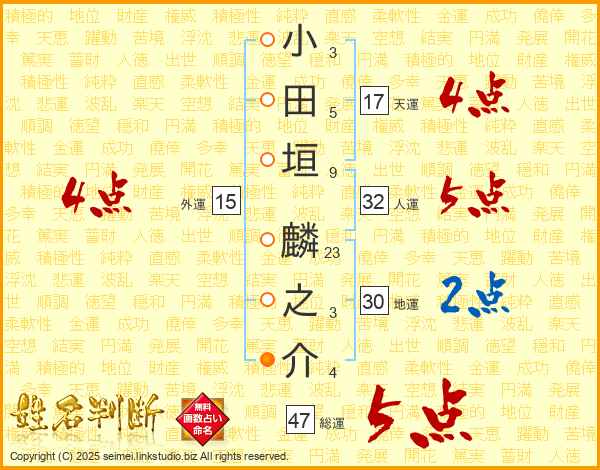 小(3画)田(5画)垣(9画) 麟(23画)之(3画)介(4画)
