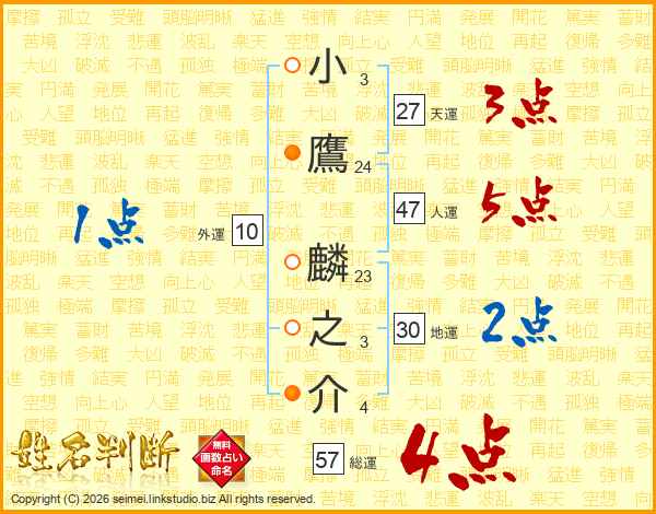 小(3画)鷹(24画) 麟(23画)之(3画)介(4画)