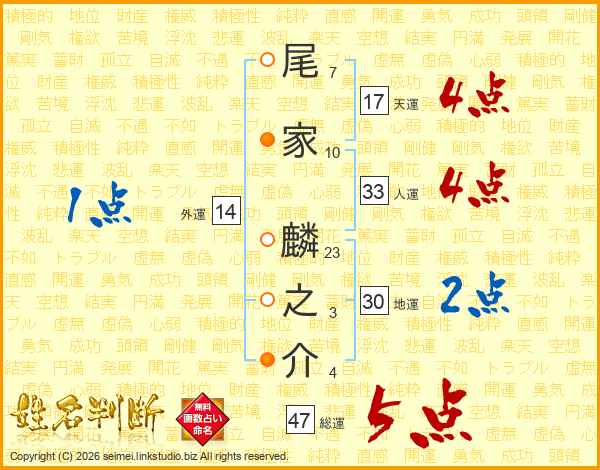 尾(7画)家(10画) 麟(23画)之(3画)介(4画)