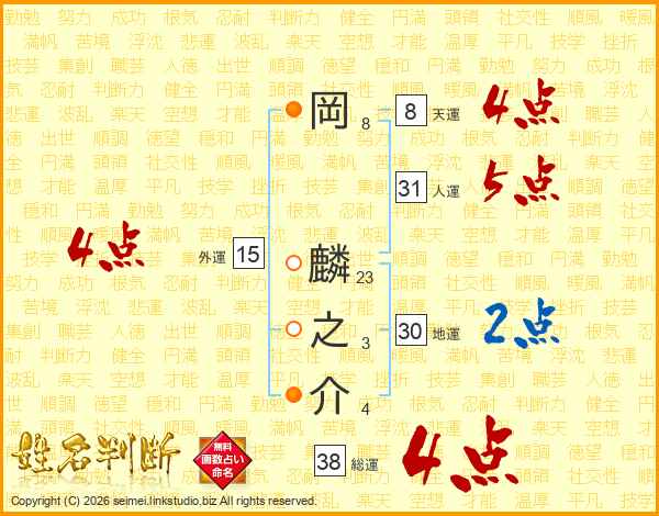 岡麟之介さんの総運は38画の4点!