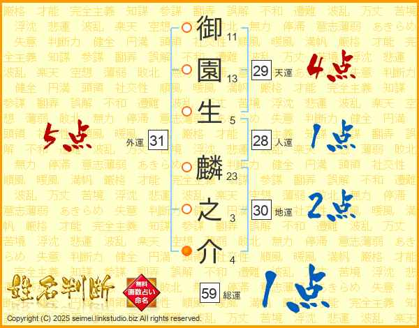 御(11画)園(13画)生(5画) 麟(23画)之(3画)介(4画)