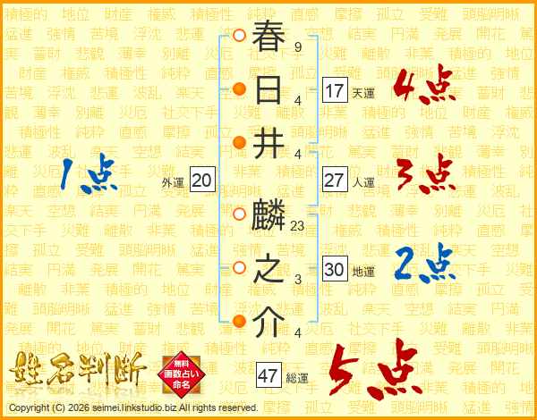 春(9画)日(4画)井(4画) 麟(23画)之(3画)介(4画)