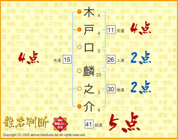 木(4画)戸(4画)口(3画) 麟(23画)之(3画)介(4画)