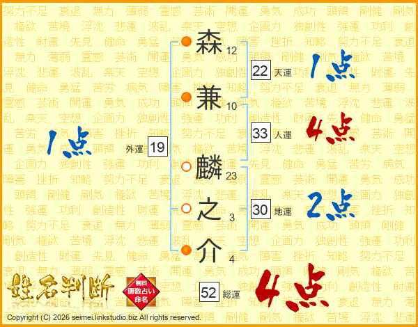 森(12画)兼(10画) 麟(23画)之(3画)介(4画)